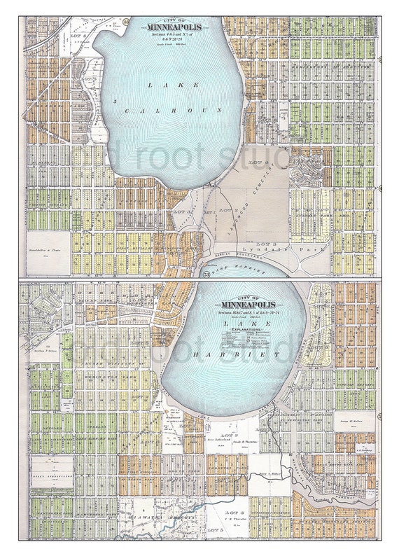 Hand Painted Map of Minneapolis, 1892 / Lake Calhoun / Lake