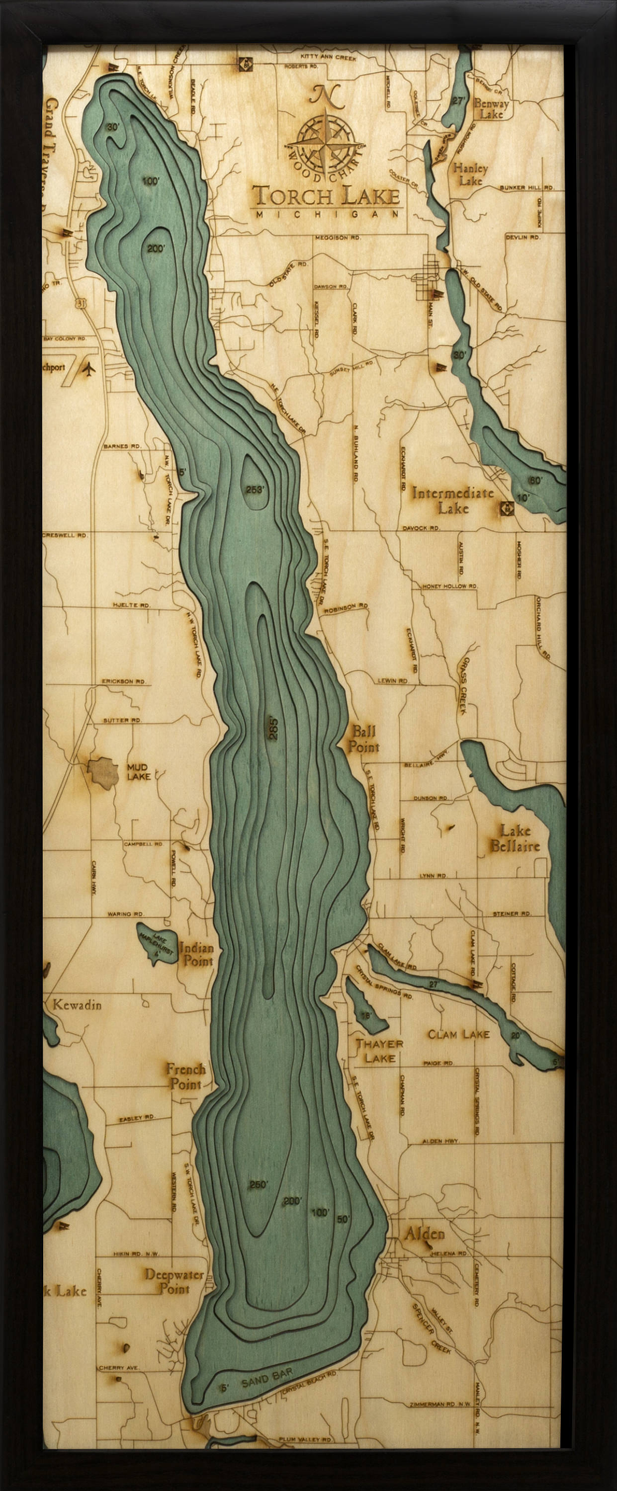 Torch Lake, Michigan Wood Carved Topographic Depth Chart / Map